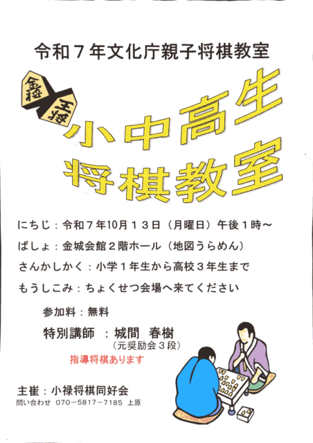 小禄将棋クラブ:小中学生限定の無料の将棋教室。2025年8月11日(月祝)ともかぜ振興会館1階企画展示室 13:00-17:00を開催します