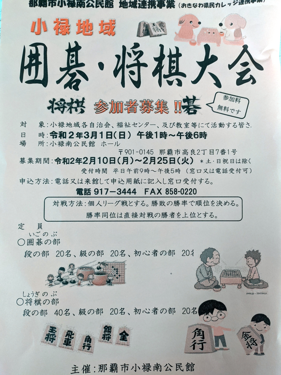 小禄南公民館では、囲碁と共同で大会を開いたり、公民館まつりでブースを出したり、新規参加者が集まりやすい雰囲気でした。